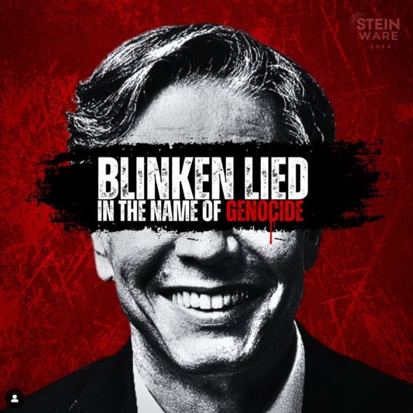 First off, please join me in making sure the Democrats NEVER forget this Genocide, starting with a reminder of the exploits of the Butcher of Yemen, Secretary of State Antony Blinken. A man who never saw a war he didn’t like, his evil and pestilential DNA is all over Gaza as well. He has the gall, the impudence, the unmitigated and shameless brazenness, to deny that Israel’s ongoing slaughter, its city-leveling, hospital-bombing, mother-and-child killing machine, is in fact Genocide.