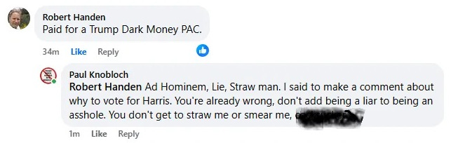 I removed the harshest reproach. I don’t want to see it taken down, but he deserved every syllable. At the end of the post, I had politely asked for people to make their own argument for Trump or Harris, but that I would be voting for neither and that they should follow suit. While I admit it’s a brutal takedown, you should know that I never drop the gloves and get nasty unless someone smears me first, or goes ad hominem.