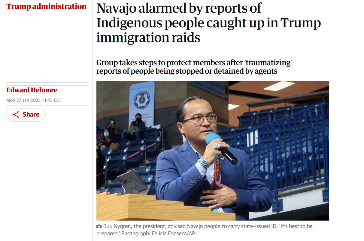 I don’t want to live in a country where people have to provide “papers” for Trump’s asshole ICE agents while they’re buying a bag of Cheetos in a convenience store. He’s sending ICE agents into Native American territory for shakedowns, Stasi style, demanding to see their documentation. As far as I’m concerned, neither ICE agents nor any other US authority has a right to demand identity documents from a Native American on tribal grounds.