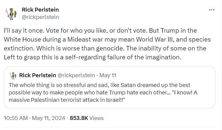 Again, into the fray, dear friends, into the black hole of the indoctrinated liberal galaxy-brain: A desperate man in a desperate world desperately tries to make up something that would justify designating Trump the “greater evil.”